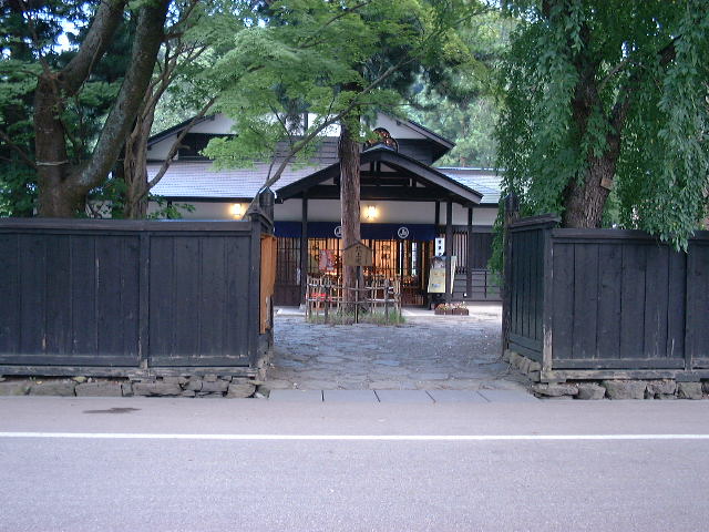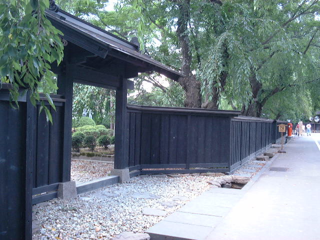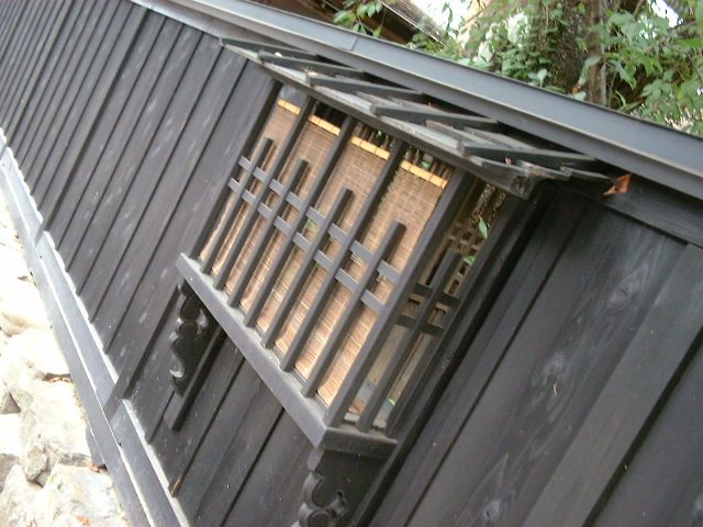 武家屋敷の周りは黒板の塀で囲まれ、 すだれのついた武者窓(のぞき窓)が ある。 |