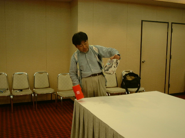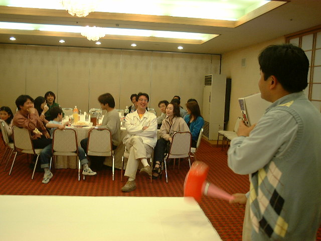 本日のメインイベント! 参加メンバーが出品したお宝グッズの オークションが始まりました。 「ピコーン!」っておもちゃのハンマー を叩きながら、品物の説明をする植松さん。 これがまたすごくうまい口調で、場が盛り 上がりました。 |