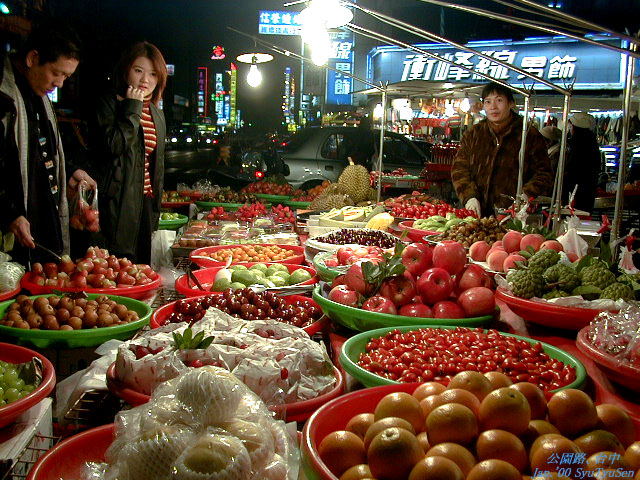 フラッシュをたかずに撮れるくらい明るくしてあるのです。お兄さんが袋に入れて いる果物は、一見リンゴのようですが、台湾独特の果物です(食べたのですが、名 前失念)。お客のおねいさんはしっかりカメラを意識しており、向こう側から撮っ たときにもちゃんと写ってました。