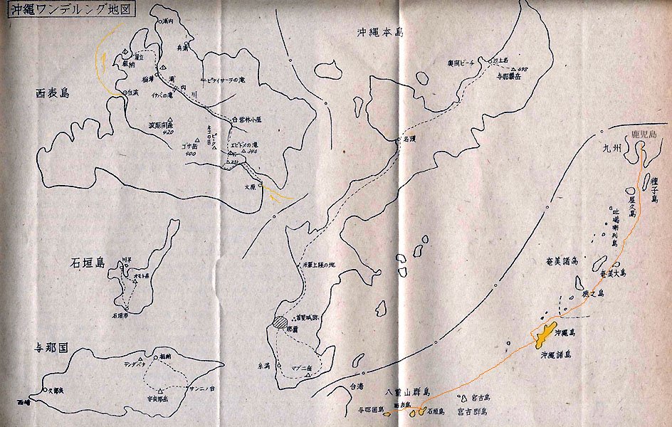 行動記録 1964年 3月31日 東京発11:00 急行「霧島」 車中泊 4月 1日 13:40 鹿児島着 鹿児島〜那覇〜与那覇岳(4/1〜5) 2日 11:30 鹿児島港発 沖縄丸1,613t 船中泊 3日 14:00 那覇着 琉球大学WV部と交流 首里城趾にあった琉大体育館泊 4日 那覇(路線バス)名護(路線バス)辺土名・比地 名護岳 奥間ビーチ泊 5日 奥間(路線バス)那覇 那覇〜石垣島(4/5〜6) 午後、那覇丸にて泊港発 船中泊 6日 12:20 石垣港着 八重山高校へ 22:24第三開発丸にて出港 船中泊 7日 与那国島(4/7〜9) 6:15 与那国祖納沖停泊 ハシケで上陸 テンダバナ、西崎へ 祖納泊 8日 宇良部岳 さんにの台 祖納泊 9日 祖納中学で交流 10:00 久部良港発 19:30 石垣港着 八重山高校校庭泊 10日 石垣島で停滞 八重山高校泊 11日 西表島(4/11〜17) 13:00 五福丸で石垣港発 西表島大原着・泊 12日 7:10 大原発 モーターボートで仲間川遡行 上陸してゴザ岳を目指すも道途絶え現在地不明のまま泊 13日 三班に分かれて偵察 上陸地点の間違いと浦内川へのルートを確認 前日と同じ場所泊 14日 浦内川沿いに下る ヒルにやられる カンピーラの滝 稲葉泊 15日 稲葉から祖納へ ヒルギやヘゴやヤシなど 大潮の海に遊ぶ 祖納泊 16日 停滞 ヒナイサーラの滝 祖納泊 17日 13:05 白浜より出港 16:30 石垣港着 石垣〜那覇(4/17〜21) 八重山高校泊 18日 オモト岳 川平湾 八重山高校泊 19日 午前中自由行動 13:10那覇丸で石垣港発 船中泊 20日 8:43泊港着 南部戦跡 琉大泊 21日 自由行動 那覇市長と面会 琉大WV部と交流、深更に至る 琉大泊 22日 泊港で解散 12名は新造観光船ひめゆり丸で出港 (鹿児島経由帰京)